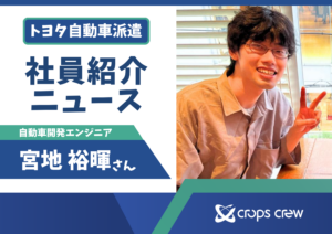 今回ご紹介するのは宮地 裕暉さん。トヨタ自動車で設計エンジニアとして活躍する宮地さんに、日々の仕事とクロップス・クルーらしさを伺いました! これまでの経歴 新卒でクロップス・クルーに… 続きを読む: ◇社員紹介ニュース vol.15◇ 宮地さん(設計)